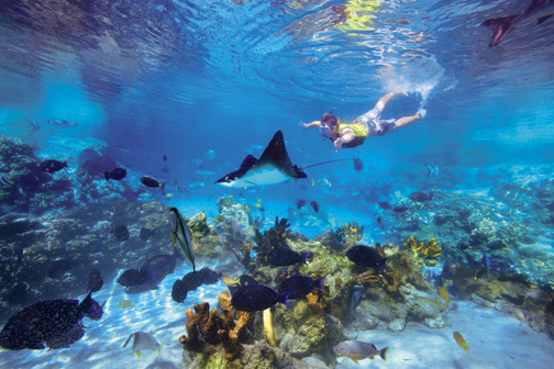 May we present the Grand Reef? Here, the underwater scenery and sea life are stunning, to say the least. You’ll want to grab that underwater camera before swimming among several types of tropical fish – angelfish, parrotfish, grunts, and, even, three different types of rays of all sizes. It gets even better – there are additional viewing tanks of reef sharks, balloon fish, and eels. And for an added family experience, there’s a smaller nursery pool that houses the younger rays, shellfish, and – our personal favorite – shark pups.