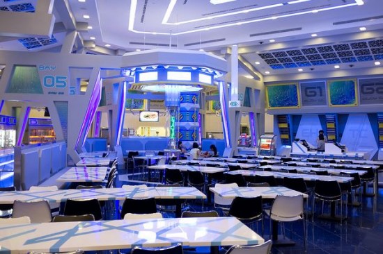 With streaks of blue lightning and unusual diagonal forms, this cafeteria style restaurant is bizarre, yet inviting. The floor is divided into two areas: a large indoor seating area, and a queue lane that wraps around the edge of the cafe. It’s kind of like IKEA’s restaurant.