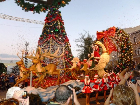 At the end of the parade, Santa arrived on his sleigh and stopped in front of the tree. Santa’s helpers, dancing Snowmen, and Rockettes in their red and white attire performed an entertaining number. With great fanfare and the help of park guests, Santa counted to three and the Christmas tree was lit as confetti sprayed into the air from the tops of nearby buildings.