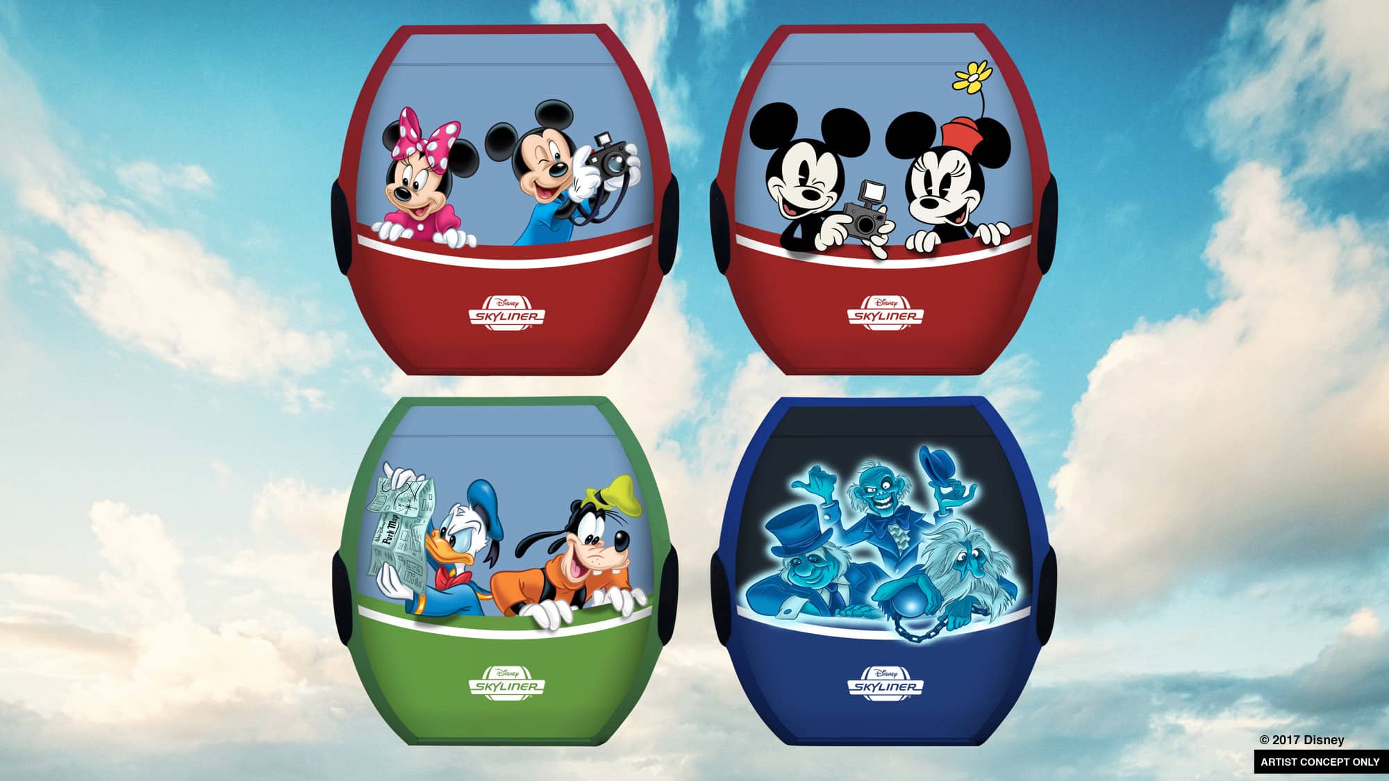 As if all that weren’t enough, Disney also let slip a few other details to expect from the Skyliner: firstly, a turn-station will be installed at Buena Vista Drive, where the vehicles will slow down and allow riders to see the various “mechanical and aerial” components that constitute the new gondola service; secondly, only “select” cabins will burnish the Disney characters that have been spotted in previous conceptual artwork (as seen below). We imagine guests – particularly those with kids – will be jostling for these “uber” gondolas.