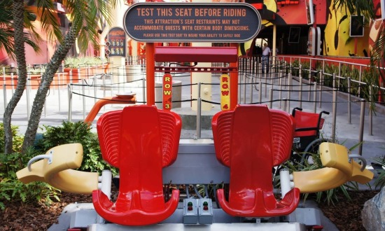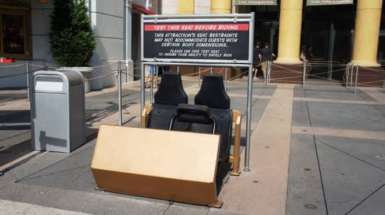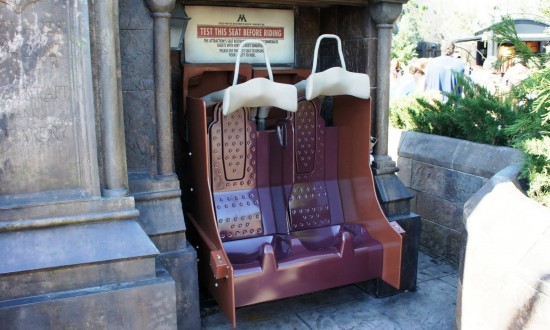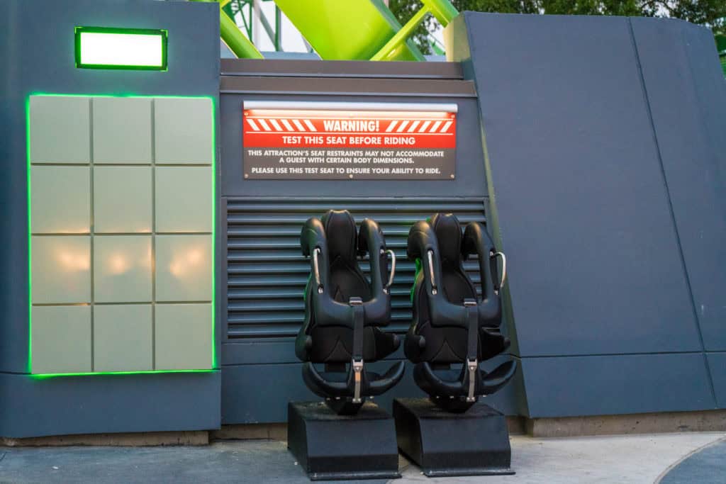 Located near the attraction entrance, each of Universal’s thrill rides has a mock-up of the seats and restraints used in the ride vehicle. Many people mistake these test seats for a photo opportunity and will take pictures or simply sit in them for a while, but they do have a purpose.