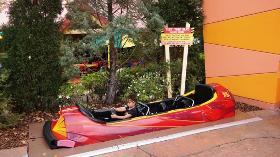 I strongly advise you to check the test seats to make sure you fit before riding either attraction! There are few things worse than waiting an hour in line only to find out that you don’t fit, and then taking the embarrassing walk of shame to the exit as everyone looks at you. Once seated in the test seats, pull in the restraint (or have your companion push) until the three lights on the side turn green — only then will you be allowed to ride.