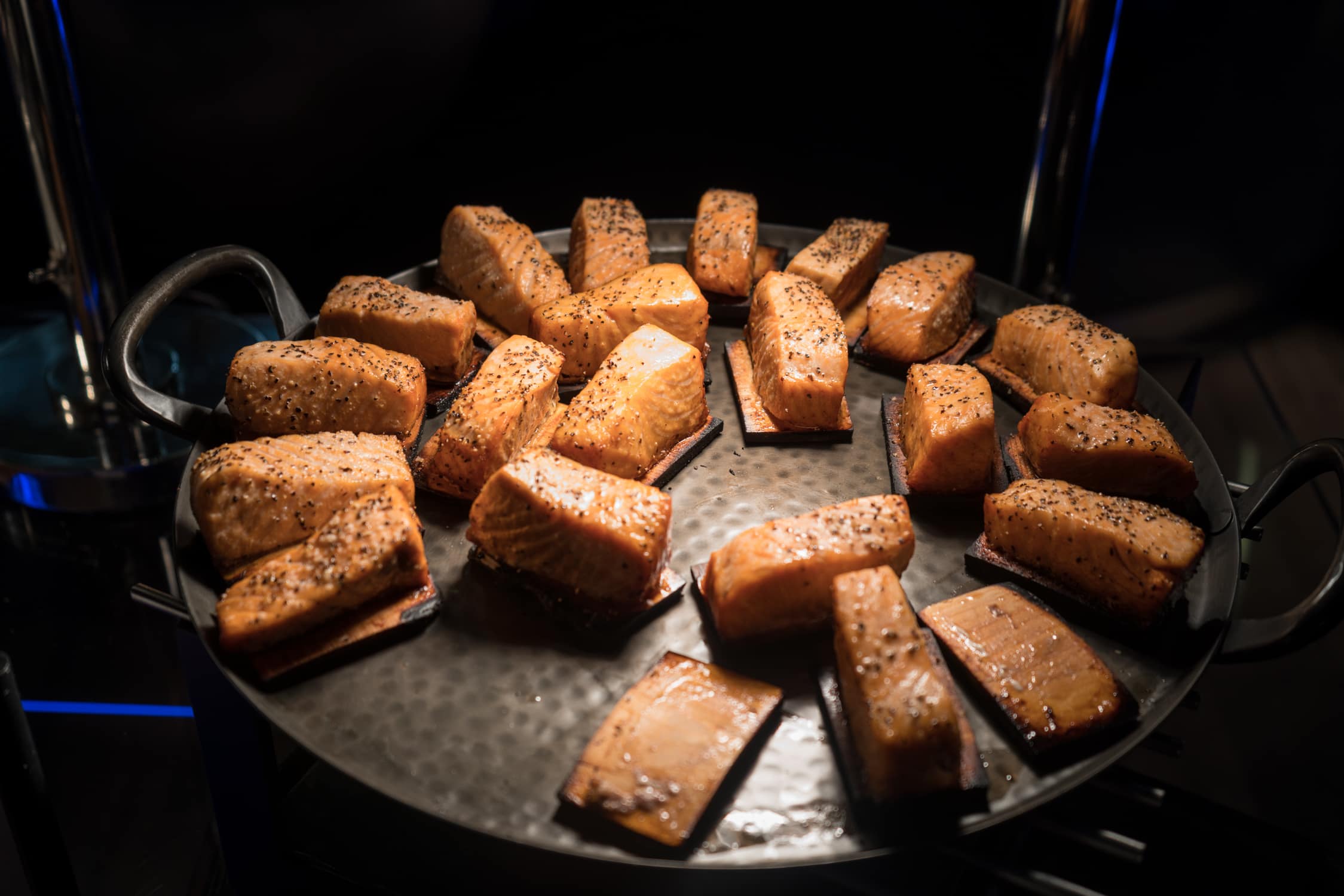 Cedar Planked North Atlantic Salmons are cooked on custom-made rotating grills at NBC Sports Grill & Brew.