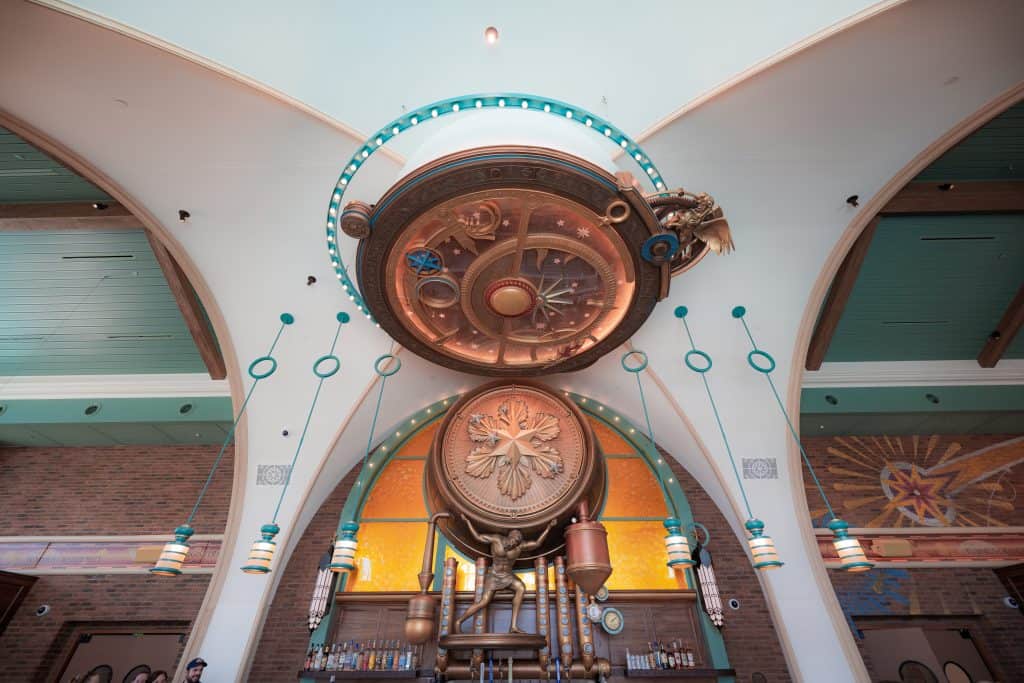 Now let’s explore the full-service dining options in Celestial Park, starting with Atlantic. This gorgeous Victorian-style eatery nestled in the heart of Epic Universe offers some of the best views of the lagoon, Universal Helios Grand Hotel, and the surrounding Celestial Park.