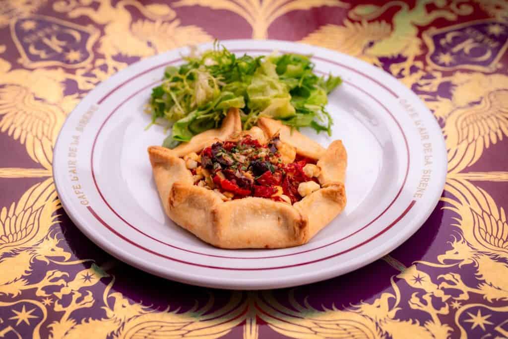 Next up in our culinary adventure is Le Gobelet Noir. This quick-service establishment belongs to a character you’ve heard tell of, Nicolas Flamel, the creator of the Sorcerer’s Stone! This is another fun restaurant to look around and spy various Easter Eggs from the Wizarding World. But let’s get to their vegan and vegetarian offerings.