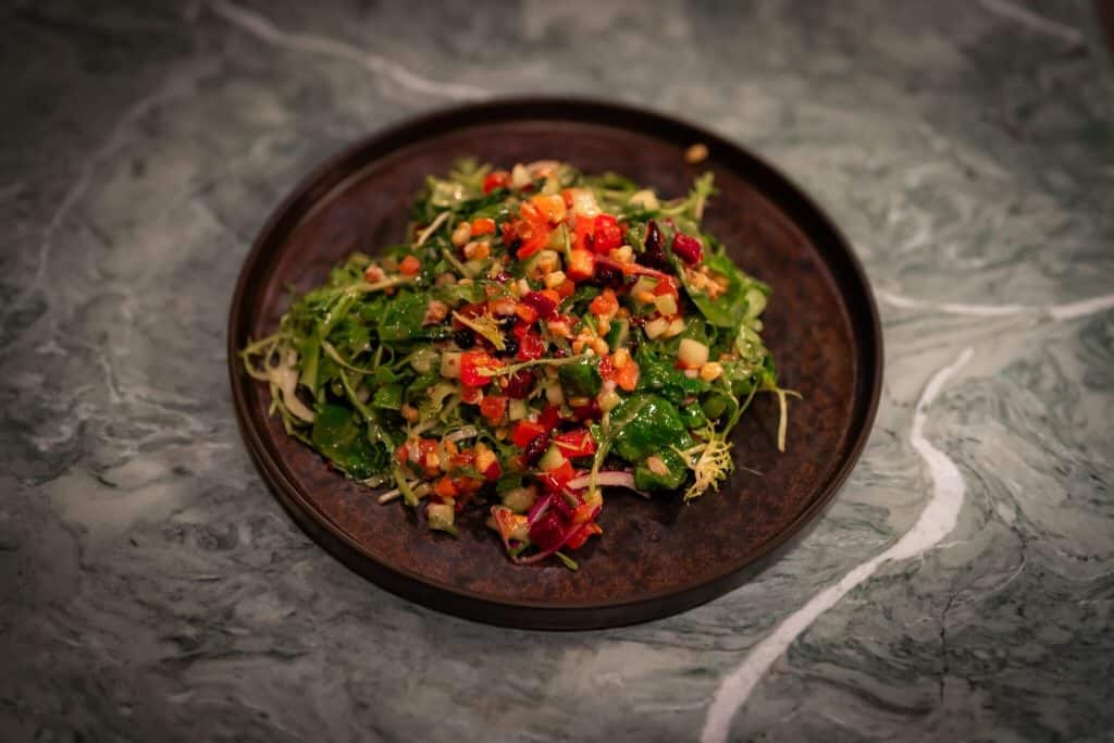 For vegans and vegetarians alike, you are in for a treat with the Romesco Romanesco. This dish stars the visually stunning, fractal-shaped Romanesco broccoli, oven-roasted to perfection and served with hazelnut romesco sauce, fregola, wild mushrooms, and delicate pea tendrils.