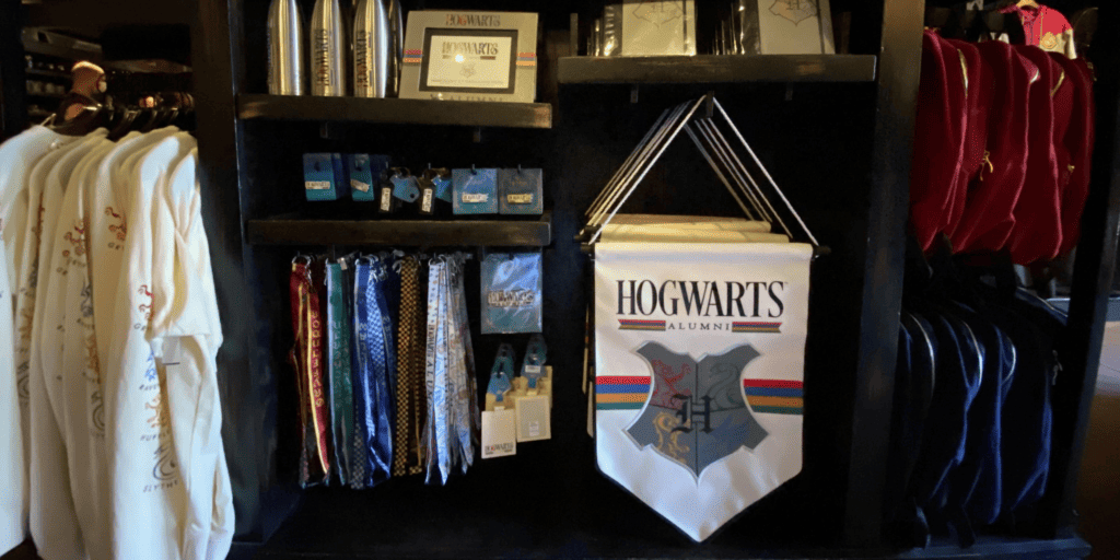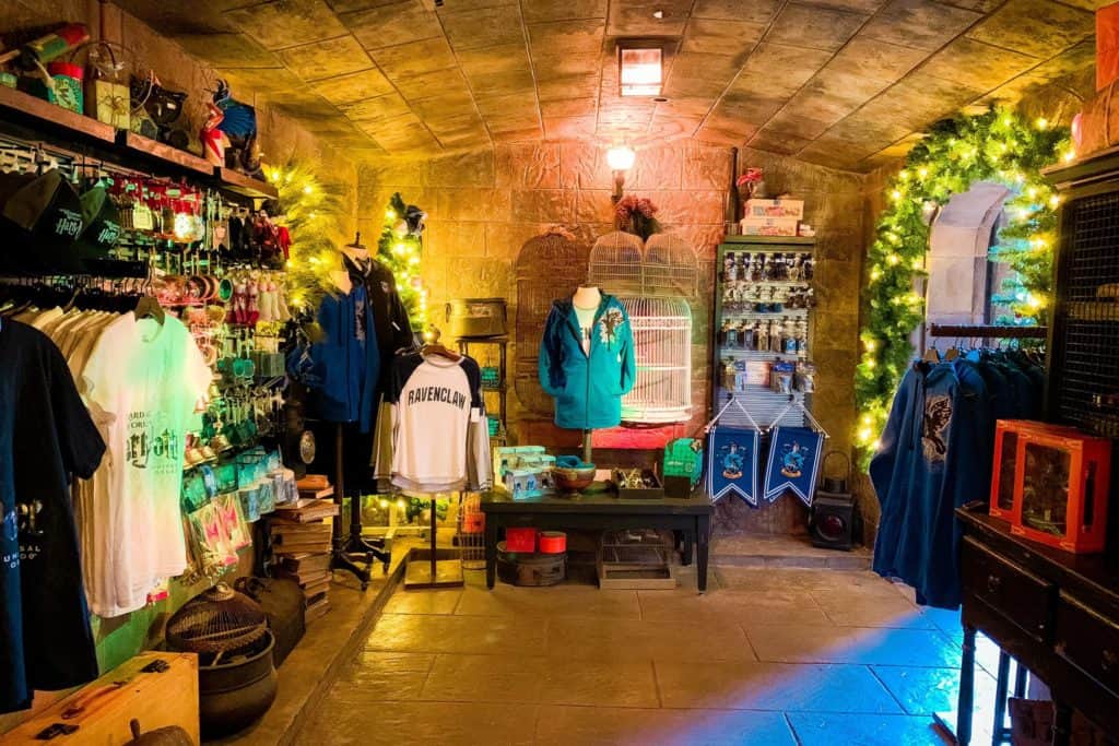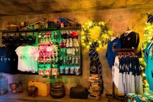 This location offers a wide range of merchandise, from classic-themed attire to unique collector’s items. All sorts of Wizarding World gear (such as shirts, hats, scarves, sweaters, ties, and backpacks) are available, along with plush toys, journals, glassware, and even jewelry.
