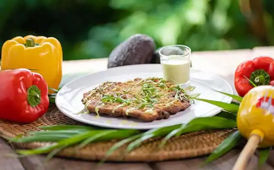 Spiced chicken, seasoned rice, onions, Latin spices, and vegetables