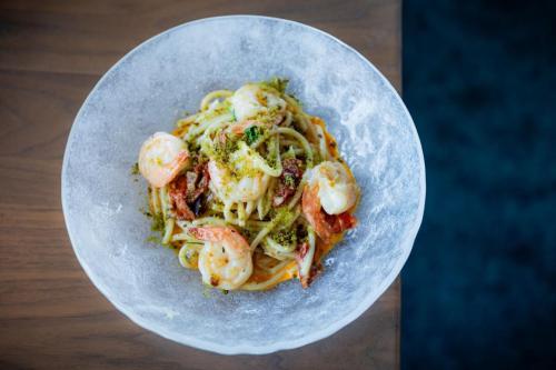 Bucatini Pasta, Sauteed Shrimp, Creamy Tomato Sauce, Arugula, Herb Breadcrumbs