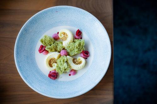 Cheesecake, Berry Espuma, Pistachio Sponge Cake, Graham Cracker Crumble, Fresh Raspberries, Raspberry Gel