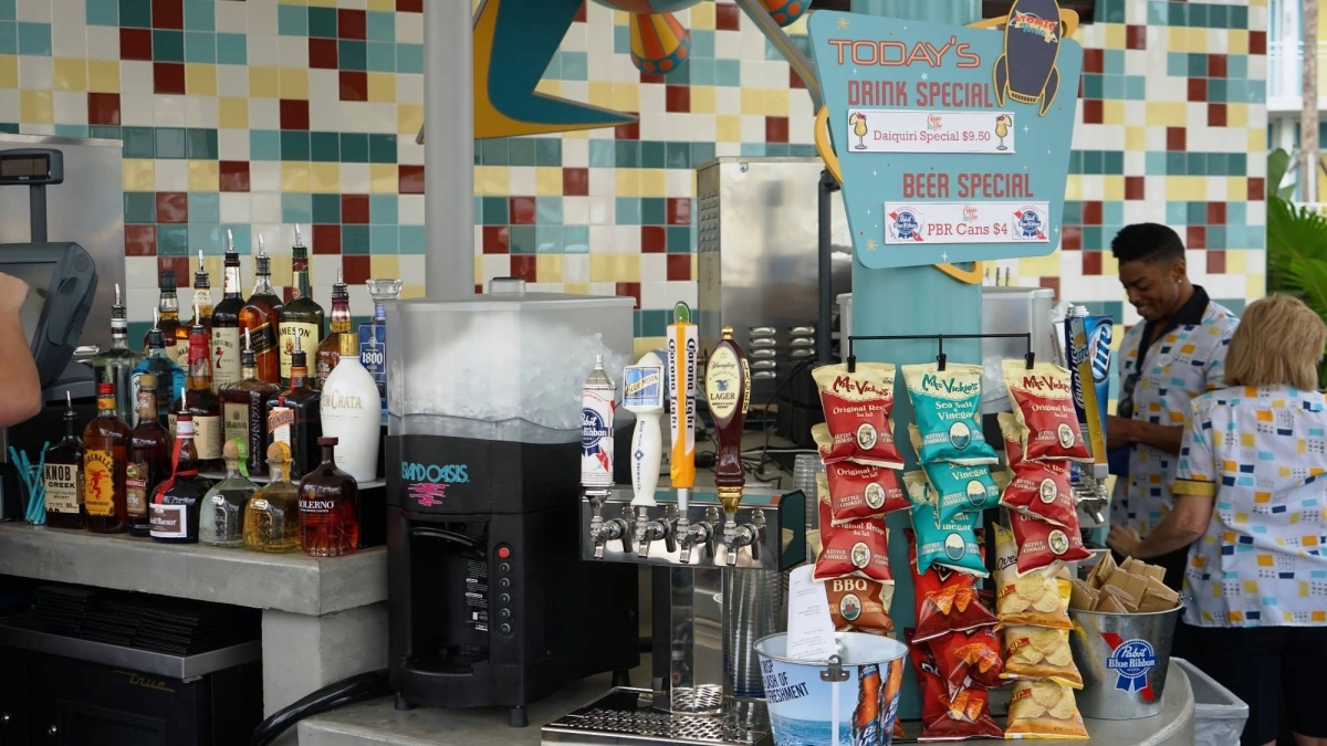 If you’re looking for a tasty snack or cooling cocktail while relaxing at Universal Cabana Bay Beach Resort, Atomic Tonic is the place to be. With some unique libations and good choices for vegetarians, both the food and drink menus are worth a gander during your stay.