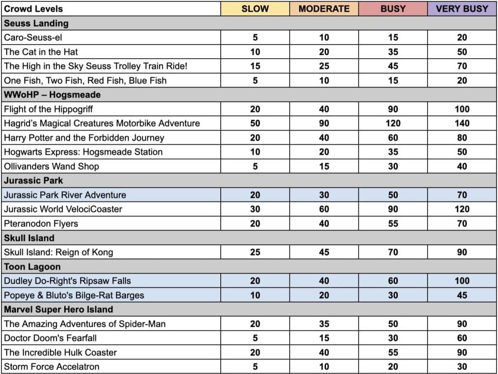 Attraction wait times based on park crowd levels at Islands of Adventure: