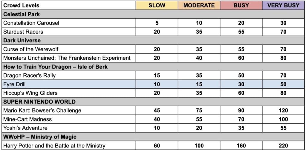 Attraction wait times based on park crowd levels at Universal Studios Florida: