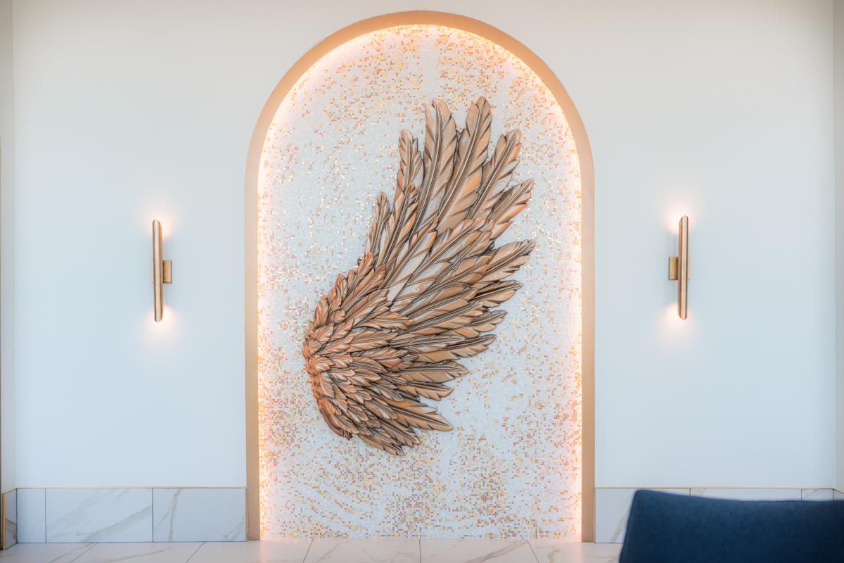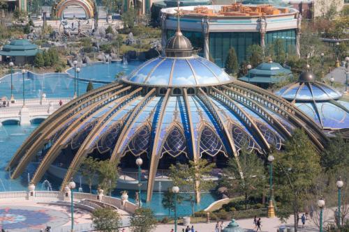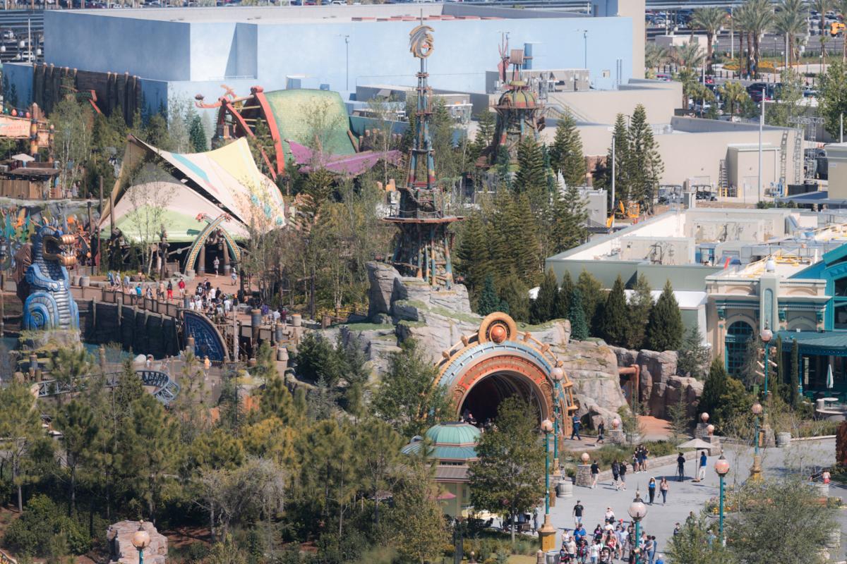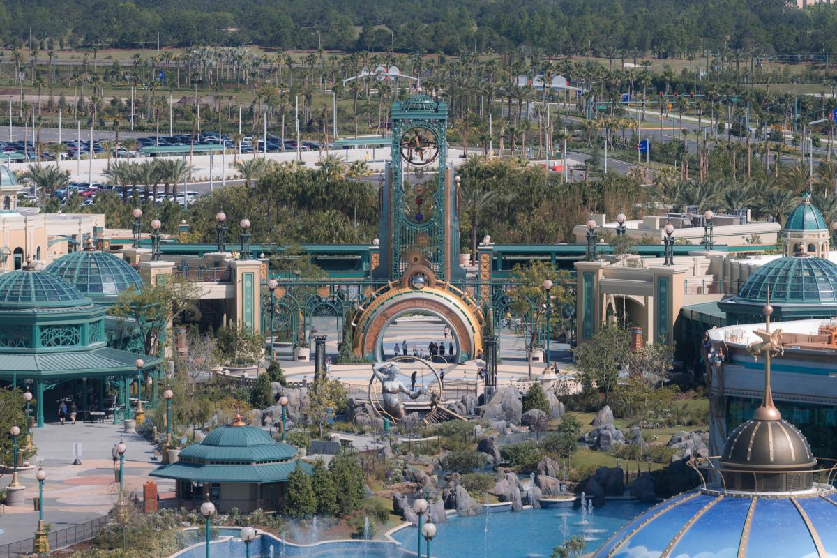 • The cartouche on the balcony of this rooftop bar is precisely aligned with the Epic Universe Chronos, the iconic centerpiece at the front of the park.