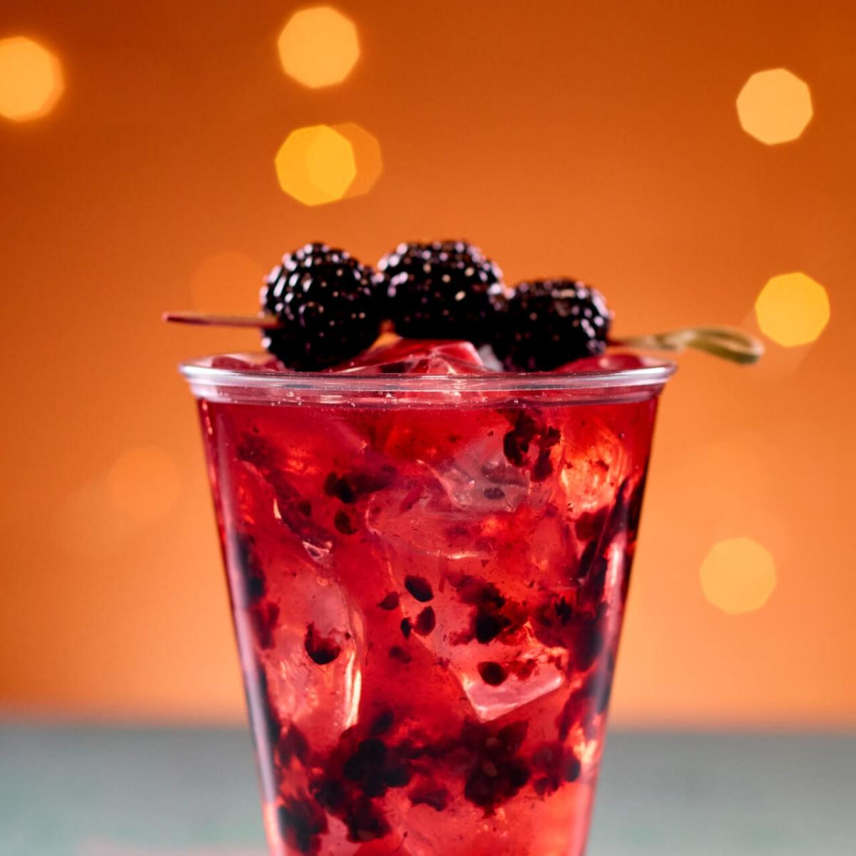 New Amsterdam vodka, DeKuyper Crème de Cassis, blackberry syrup, lime juice, soda water, mint sprig