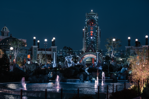 This area truly comes alive at night. Look closely—the lights atop each portal send out beams that converge at the Chronos that stands at the front of Celestial Park.