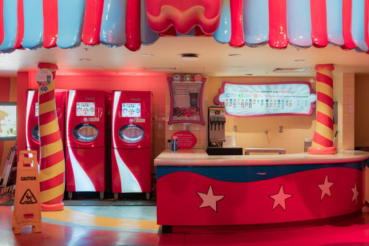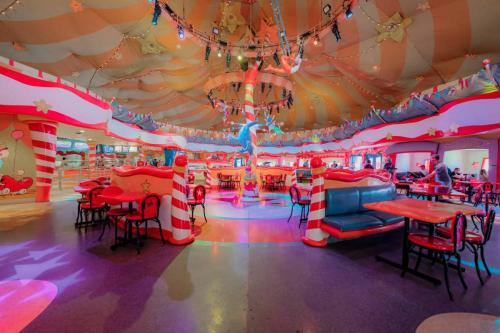 Trapeze caricatures swing high above while glowing lights, colorful flags, and fanciful decorations soar overhead. Themed booths located around the café’s perimeter give the illusion of patrons sitting in individual circus train cars – many booths even feature windows to the outside, enabling you and your party to act as the carnival attraction for onlookers nearby while you dine!