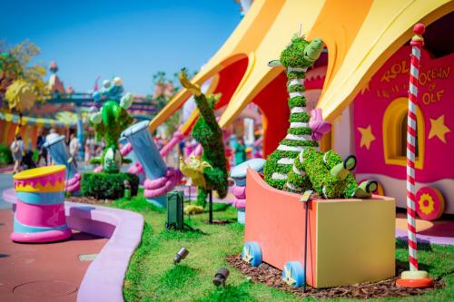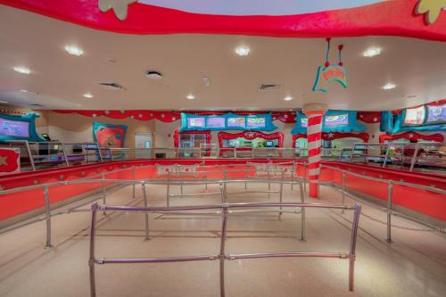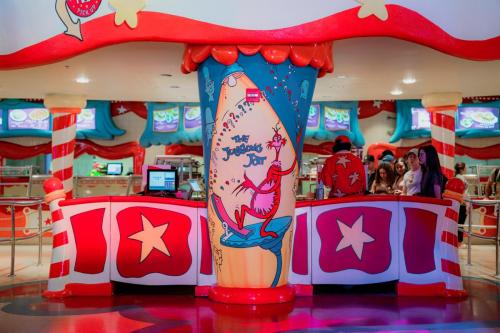 In addition to these stupendous surroundings, “The High in the Sky Seuss Trolly Train Ride” takes a whirl through the café on its track high above, providing further eye candy or a chance to wave at guests as the food coma sets in. Also, periodic live shows featuring the Seussical friends performing to music occur on the floor stage. Led by the ring master himself, children in the crowd are invited to join in on the fun.