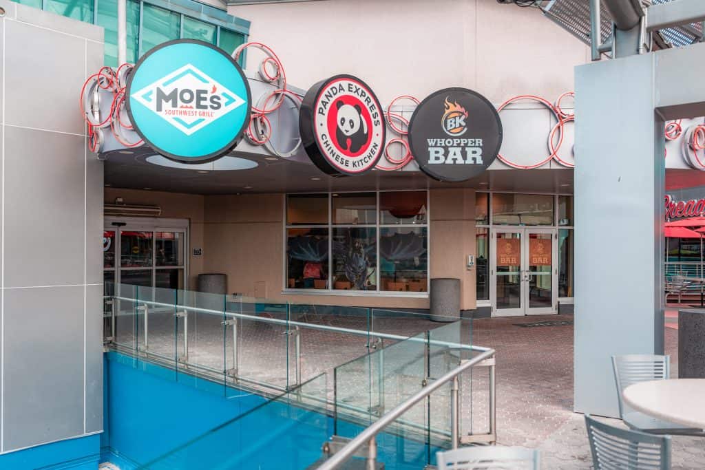 The CityWalk food court is one open location comprised of three quick-service restaurants. The Burger King Whopper Bar, Panda Express, and Moe’s Southwest Grill occupy a small, shared space, cafeteria-style. Each establishment has its own separate menu and counter for easy ordering.