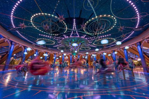 - The Constellation Carousel’s ceiling features an enchanting Star Tracker, showcasing rotating celestial star patterns. At its center, the Mesmerizer creates a captivating ribbon cone effect overhead.