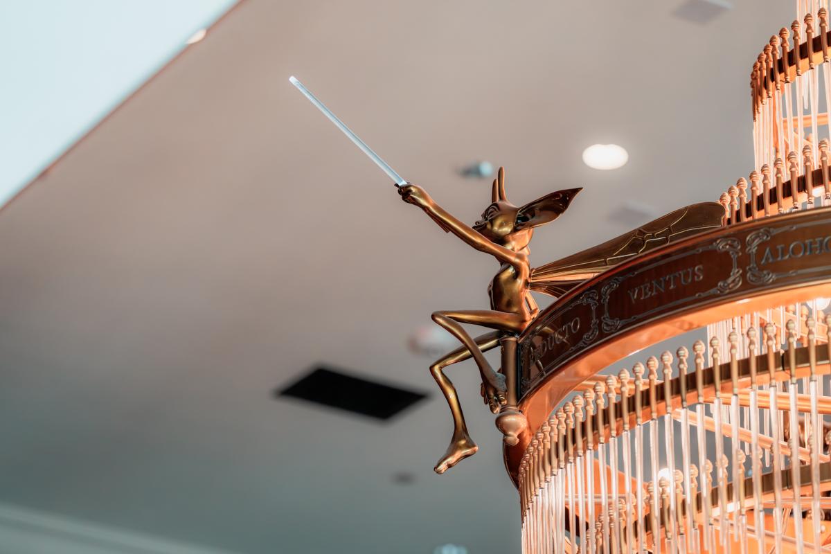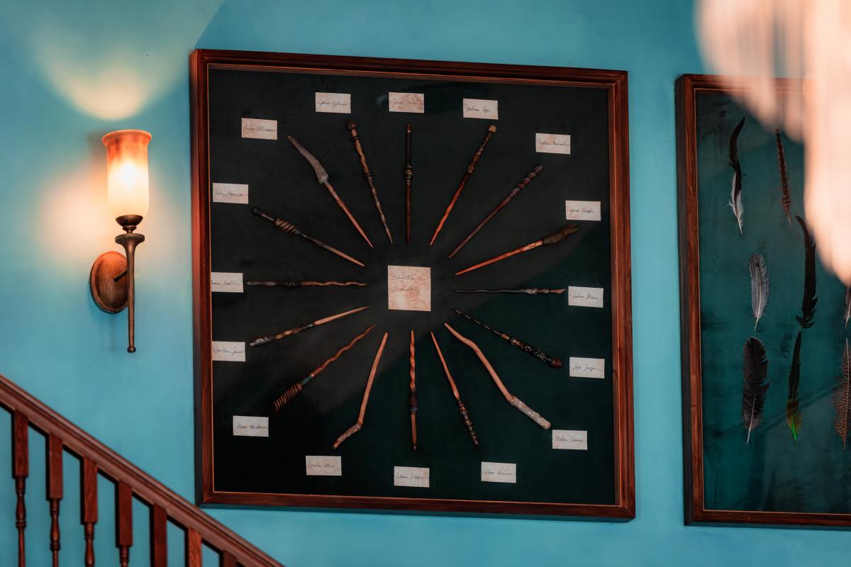 - This shop features a stunning chandelier crafted to complement the remarkable wand designs. It includes over eight hundred crystal wands and is adorned with brass Pixies.