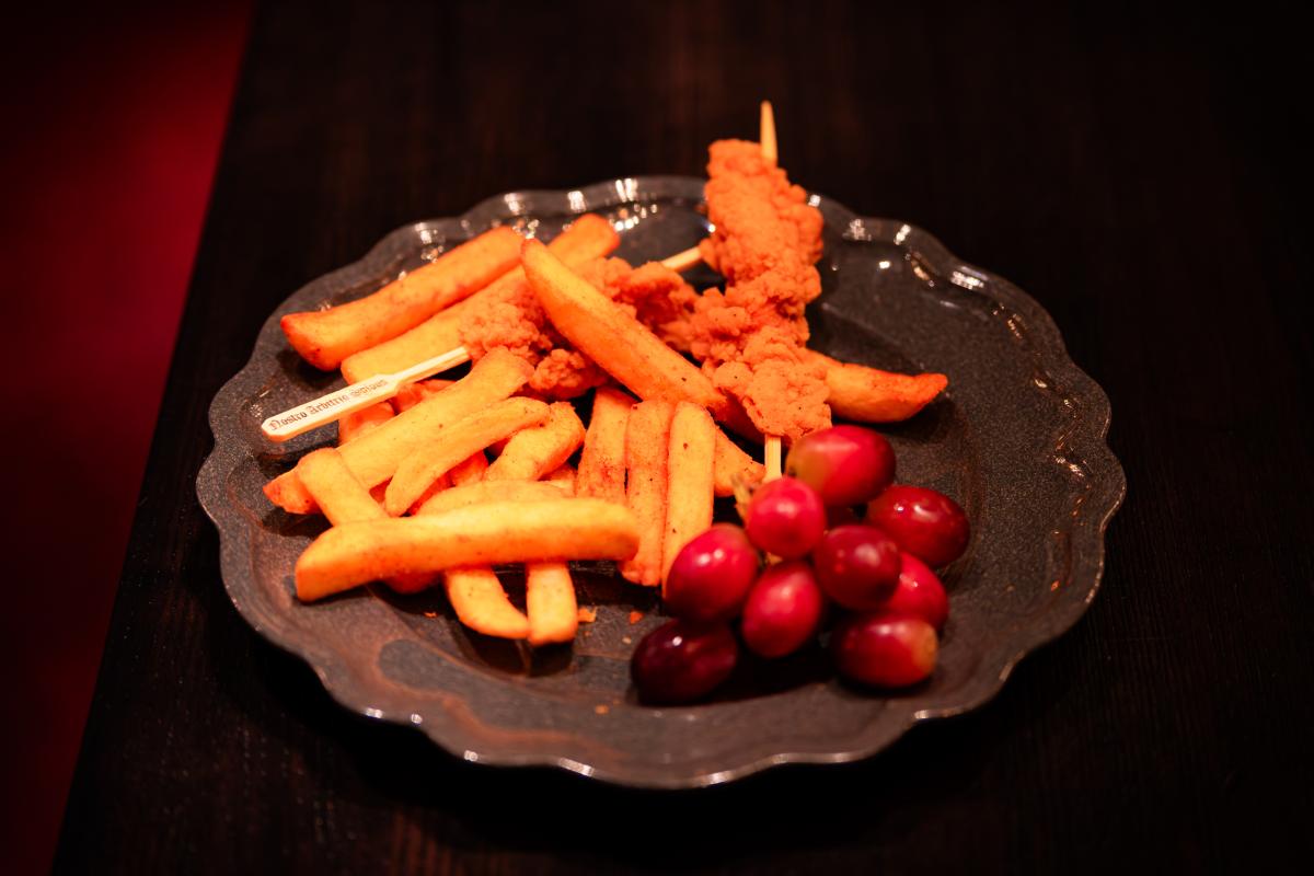 Crispy chicken tenders served with grapes and fries