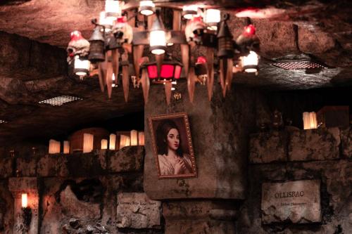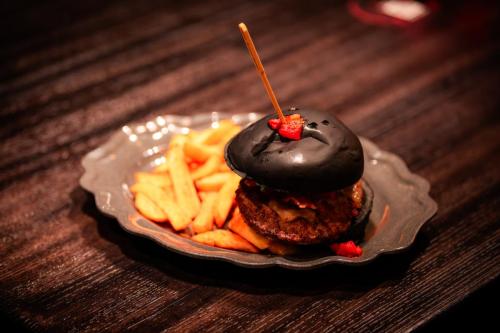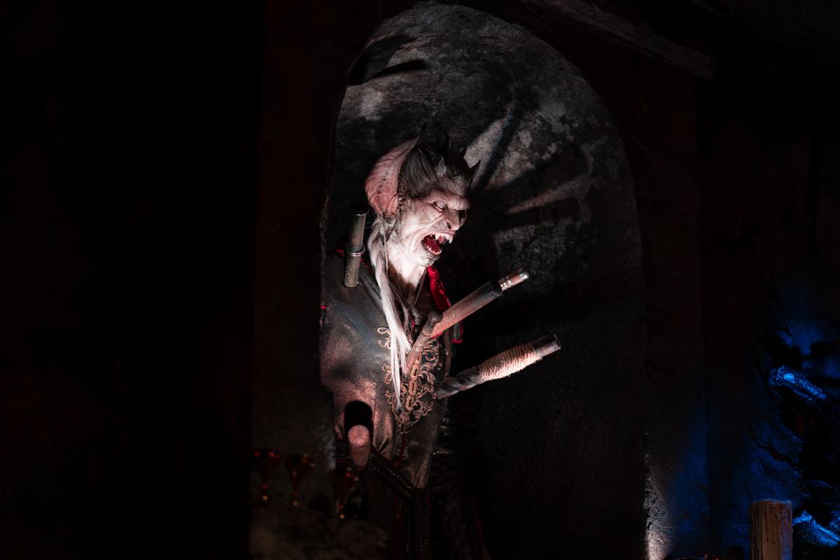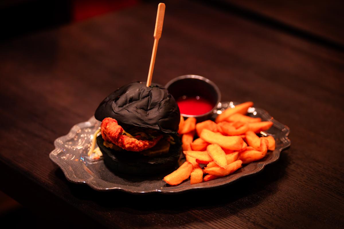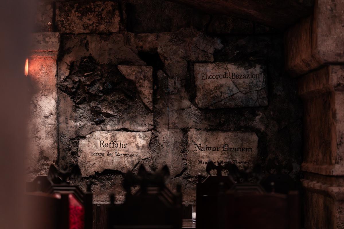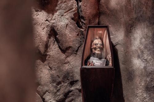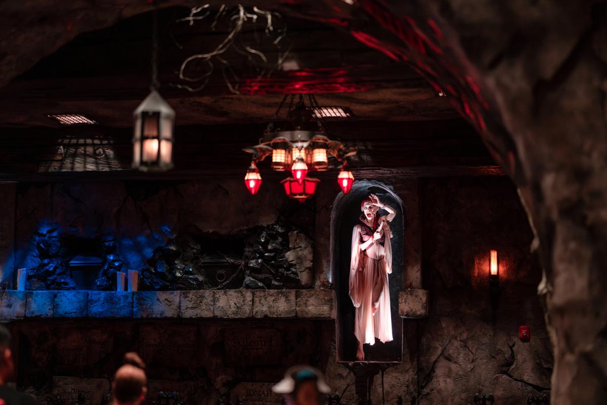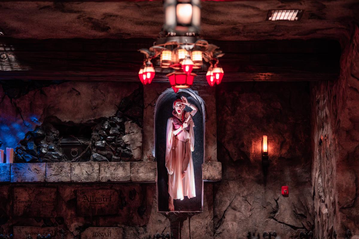 Dine at Das Stakehaus, a cleverly named restaurant that plays a playful nod to one of the vampire’s classic weaknesses: the stake. This fast-casual restaurant run by “familiars” rests atop of the ancient catacombs where the Darkmoor vampires reside. As you dine above, they dine below.