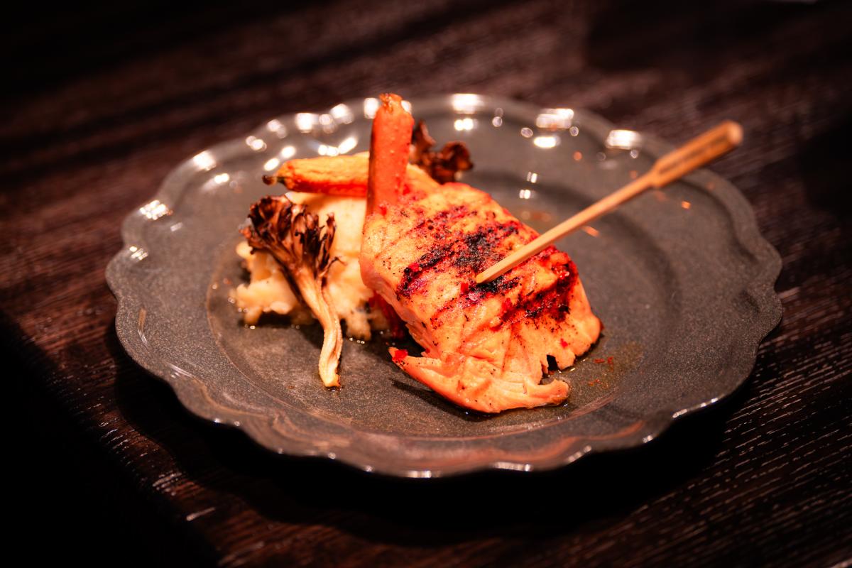 Blackened salmon steak with charred green onion mashed potatoes, roasted baby carrots, acorn squash, crispy maitake mushrooms