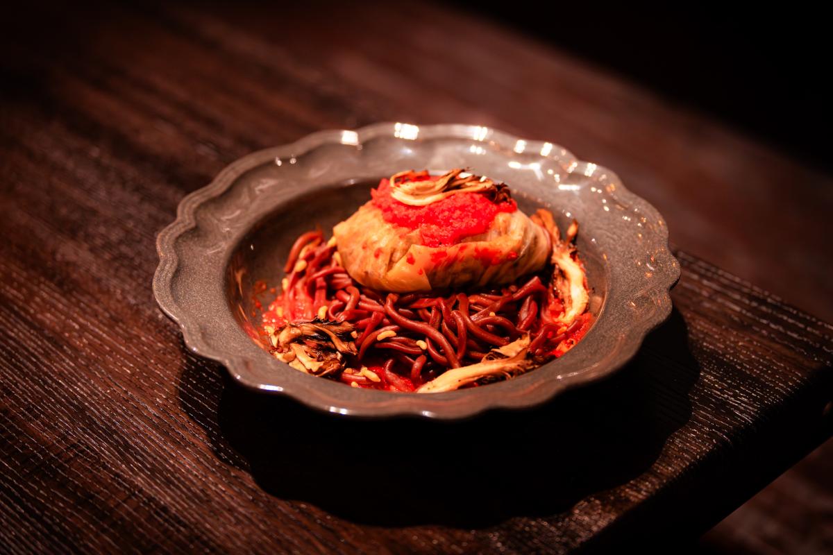 Impossible stuffed cabbage, beet bucatini, in a bell pepper tomato sauce