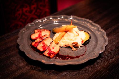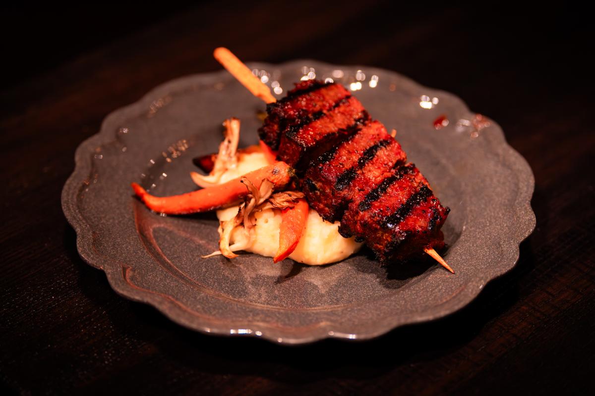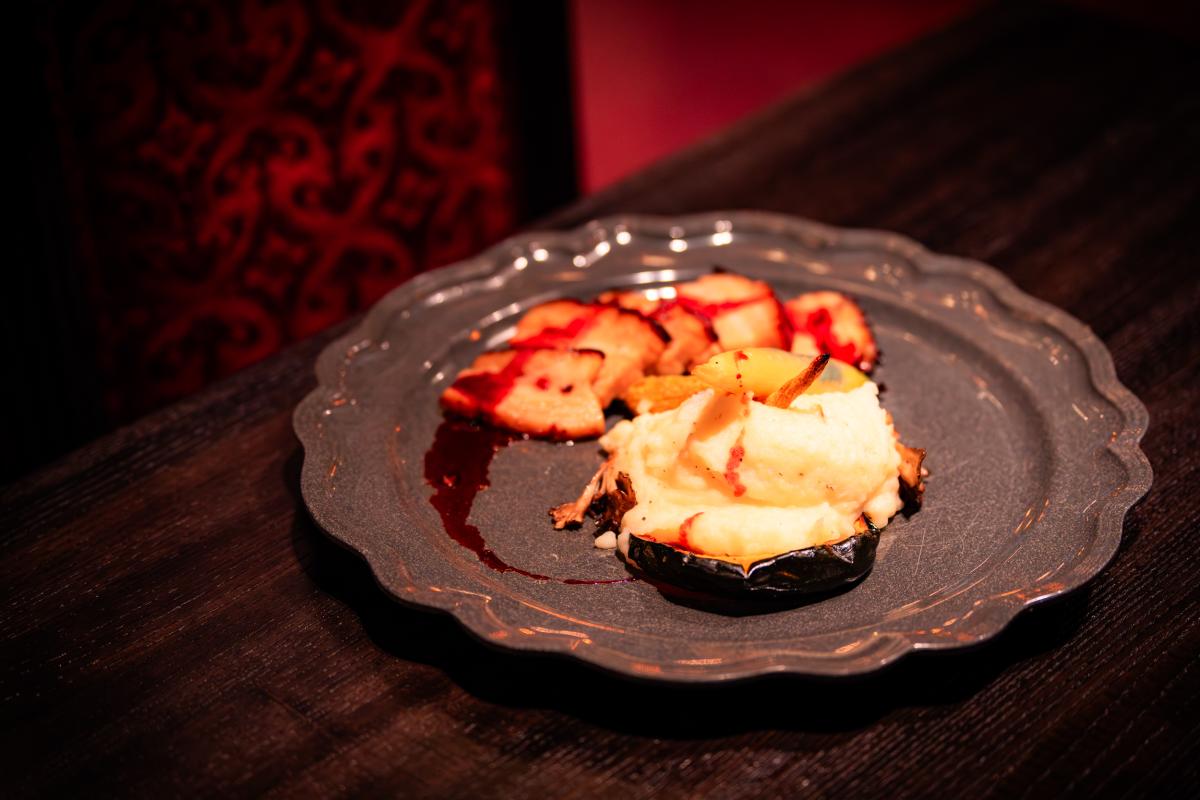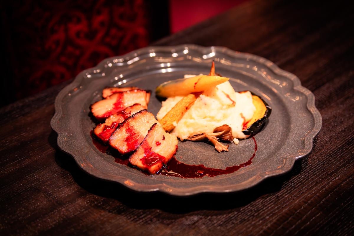 Char siu-style roasted pork belly with bloody roast pork dipping sauce, charred green onion mashed potatoes, roasted baby carrots, acorn squash, crispy maitake mushrooms