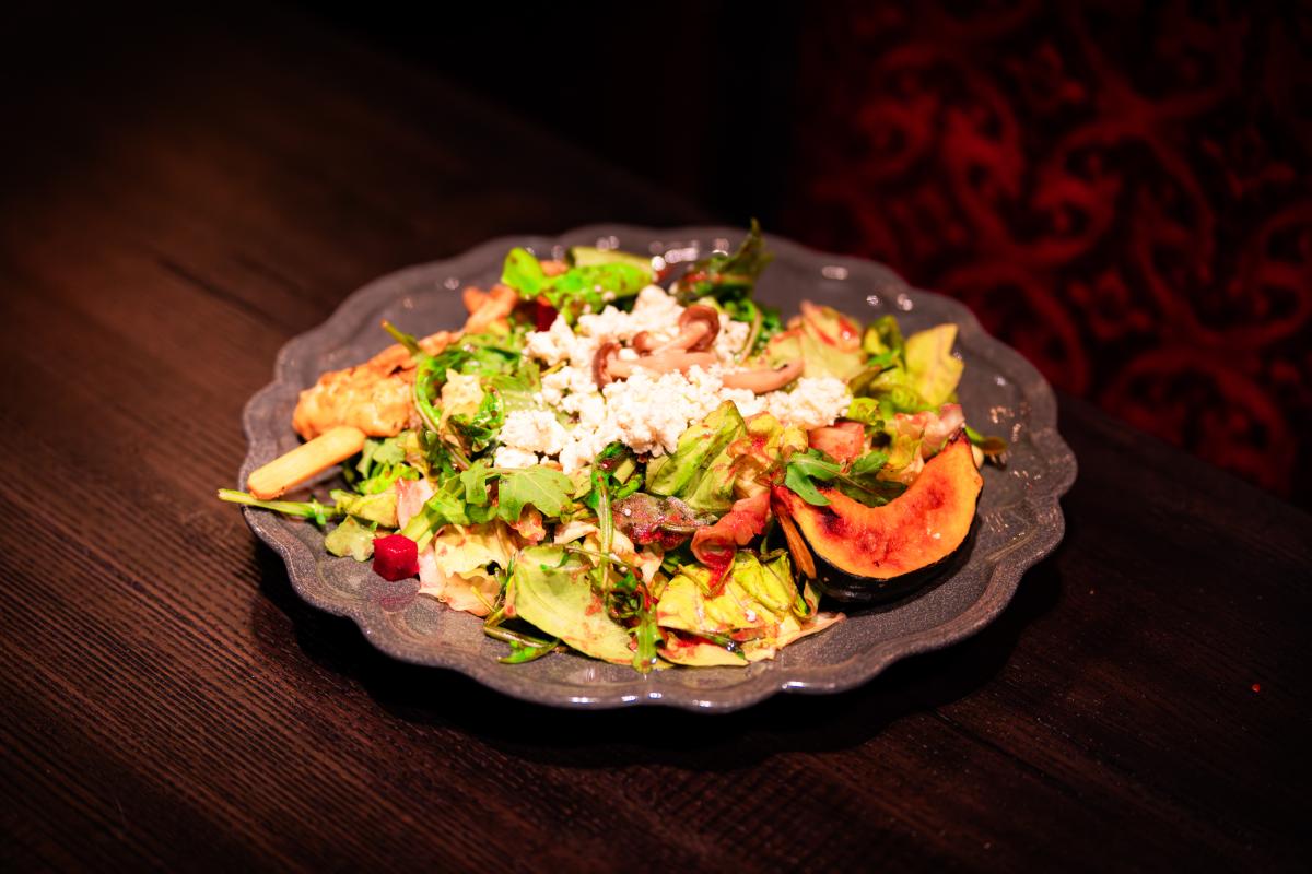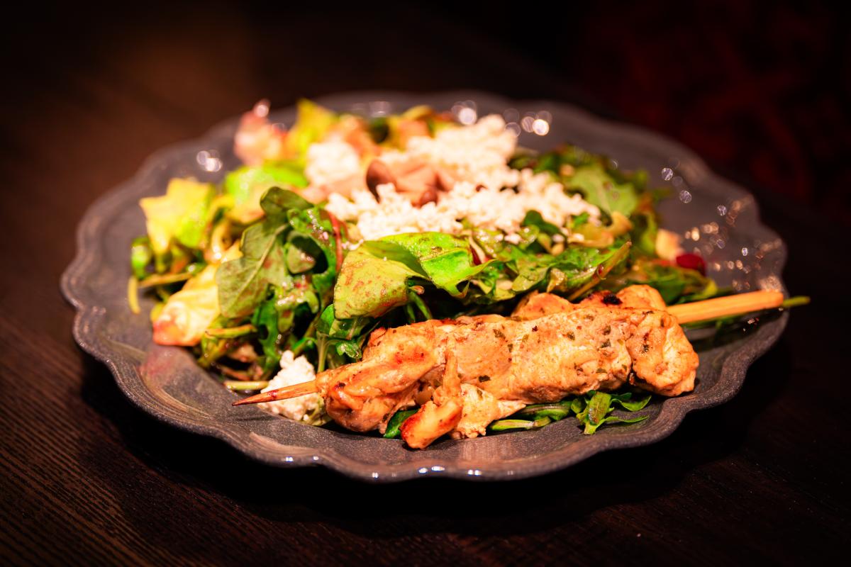 crispy maitake mushrooms, acorn squash, red beets, blue cheese, arugula, and bibb lettuce tossed in a blueberry pomegranate dressing with a grilled chicken stake