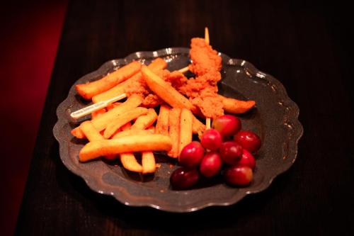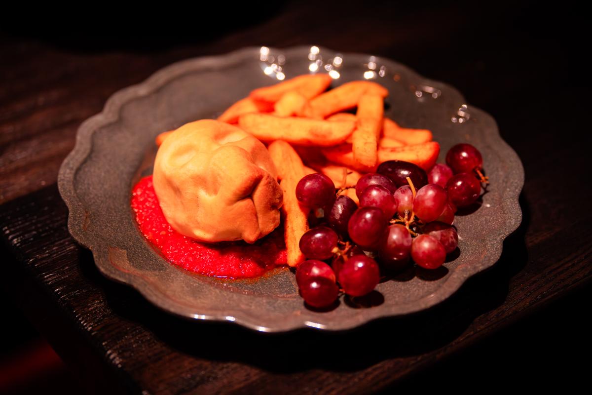 Pepperoni and cheese stuffed pizza skull served with grapes and fries