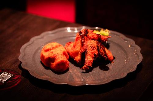 Darkmoor spicy chili-dusted fried wings with smoked cheddar, charred scallions, pimento cornbread skull, and soy chili garlic sauce, served with a familiar slaw