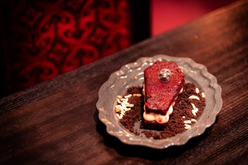 Red velvet heart “beet” coffin cake with chocolate crumbs and puffed rice maggots