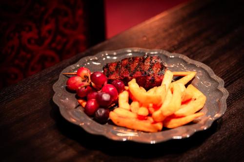 Grape jelly glazed brisket meatloaf served with grapes and fries
