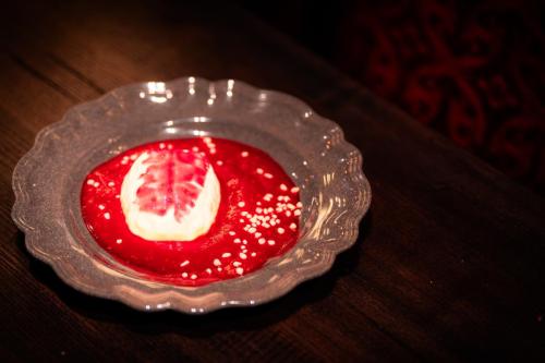 Greek yogurt vanilla panna cotta brain with raspberry sauce