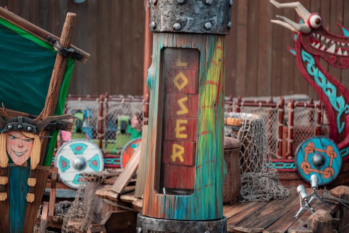 Fyre Drill’s water cannons shoot over 28 feet through the air to reach the many targets throughout the ride, along with other Viking ships.