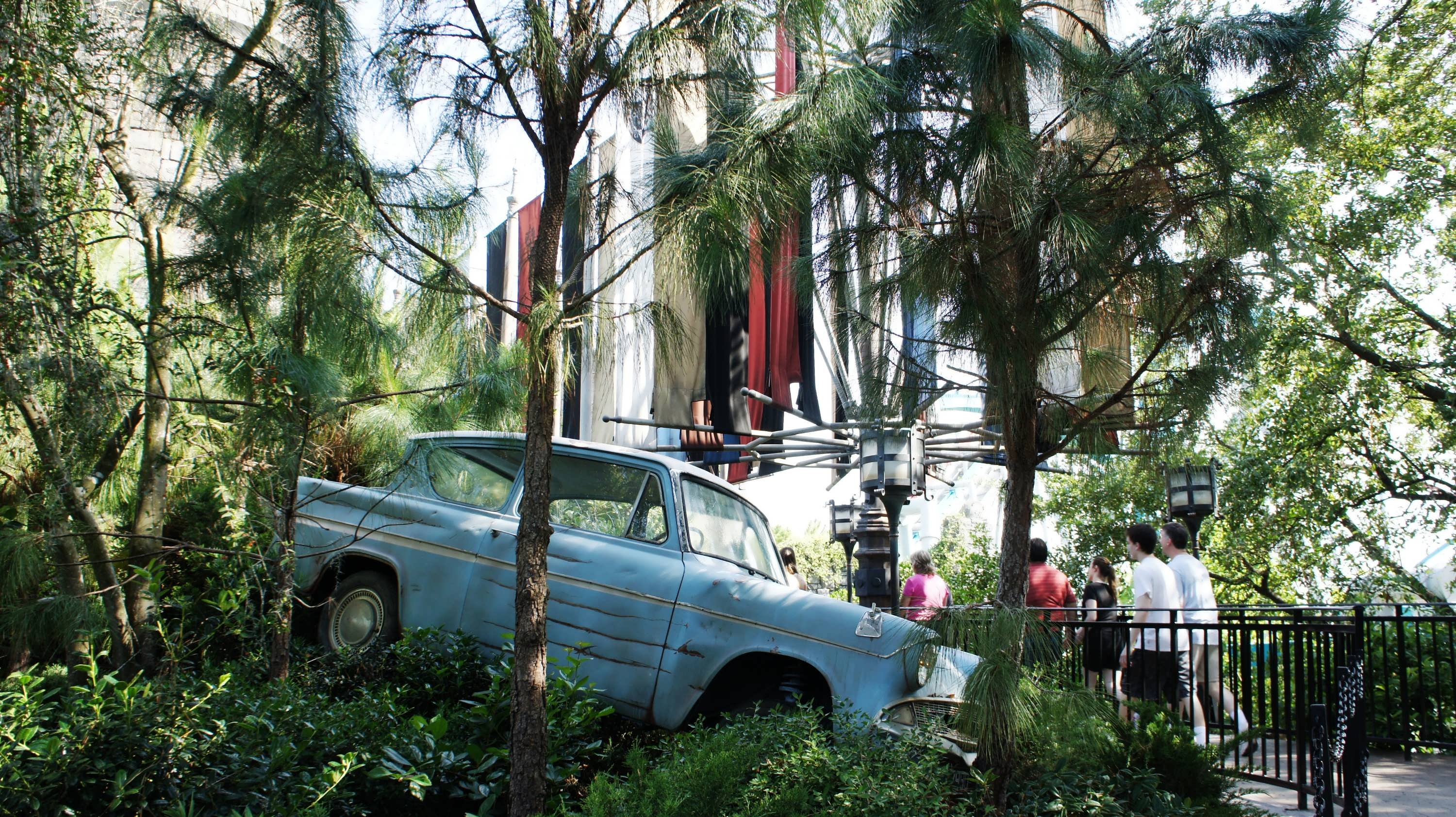 And there was one more surprise waiting. Just before crossing the bridge and entering the castle, guests could check out Ron’s wrecked car — one of the actual vehicles used in the movie production. This is one of the actual vehicles used in the movie production: