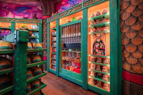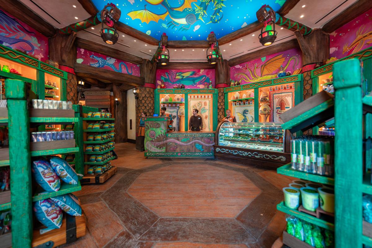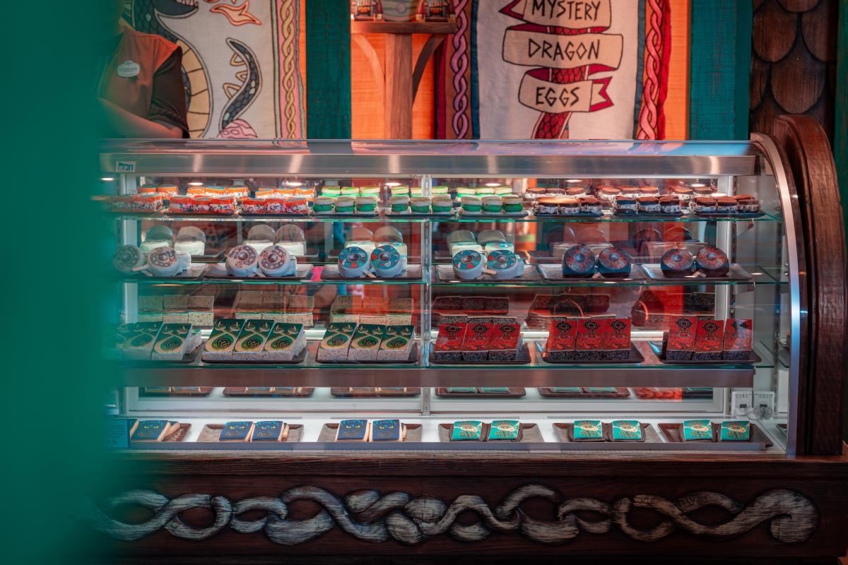 Stop by this merchandise location to uncover mystery chocolate dragon eggs, each concealing a trading card inside its dragon house-themed packaging. You can also indulge in fluffy, sheep-shaped marshmallows or treat yourself to cookies, crispy rice treats, and whoopie pies, all decorated with dragon designs.