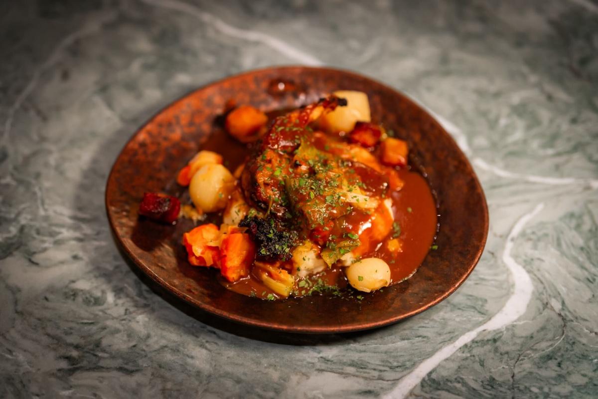 Hearty stew of lentils, vegan bacon and root vegetables, served with an artisan bread