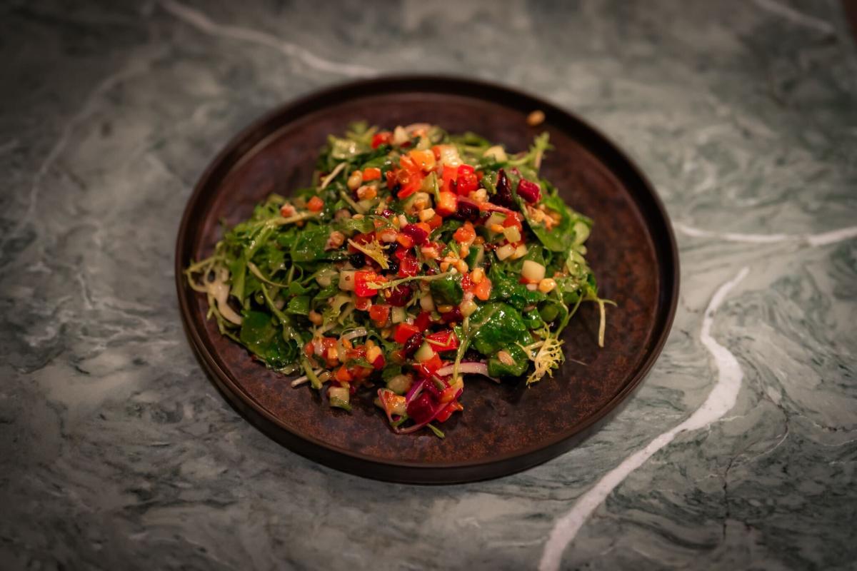 Kale, arugula, frisée, cucumbers, tomatoes, red onions, and beets drizzled in an herb vinaigrette
