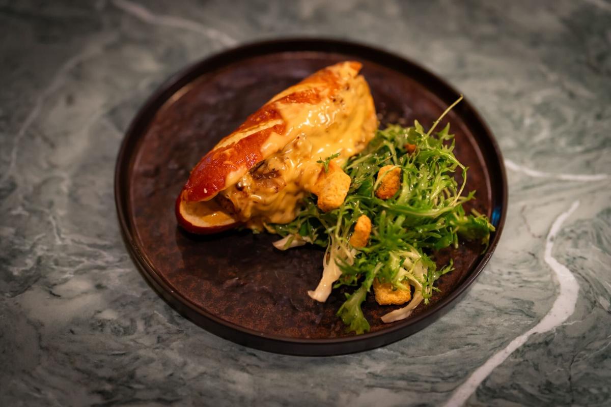 Roasted bratwurst, caramelized onions, Wizard’s Brew beer cheese, German mustard, served in a pretzel bun, with choice of house salad or tavern frites