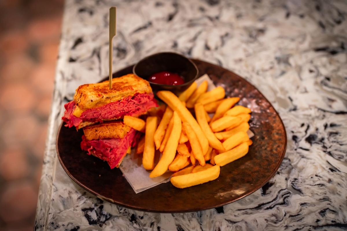 Shaved corned beef, butterkäse, German mustard, hearty multi-grain bread, with choice of house salad or tavern frites