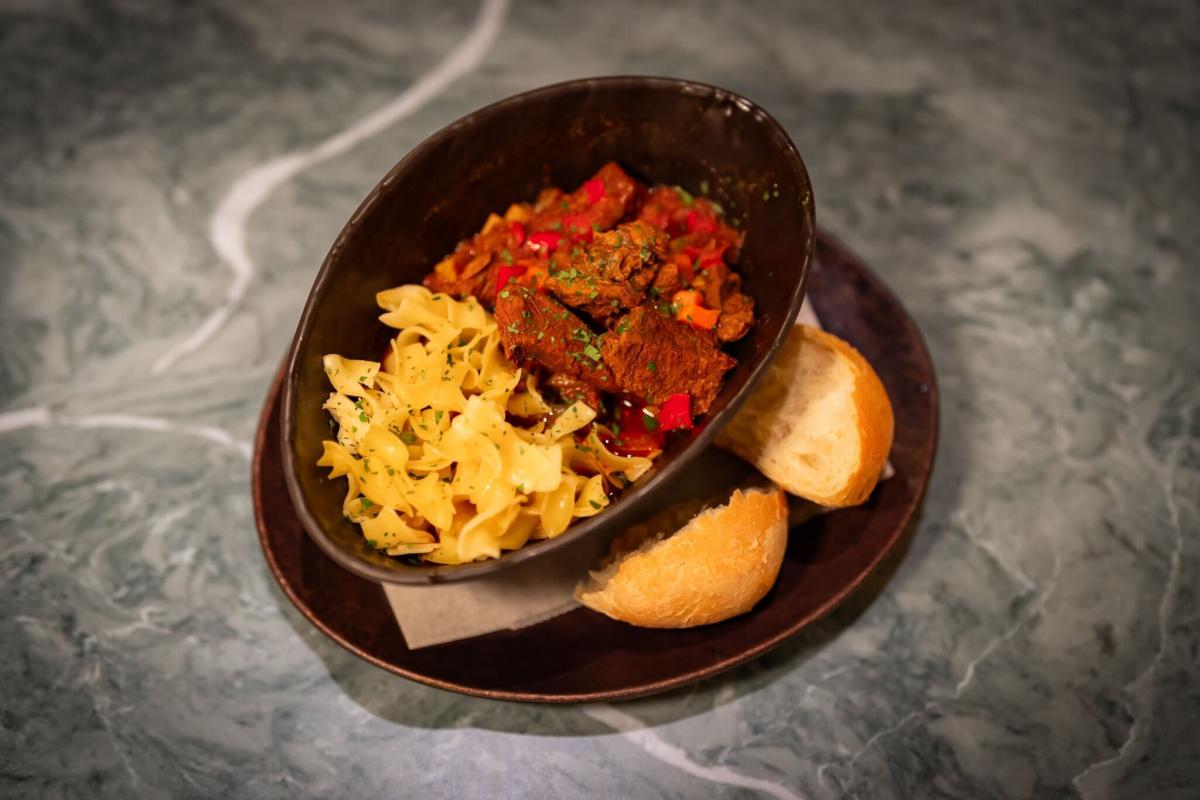braised beef stew with tomatoes, peppers, potatoes, seasoned with Hungarian paprika, and egg noodles