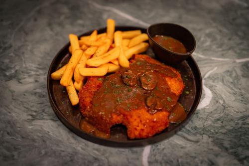 crispy pork cutlet, brown mushroom gravy, and tavern frites