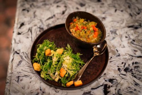 Rich chicken broth with knödel, roasted chicken, and herb brioche croutons, served with a house greens salad drizzled in Champagne vinaigrette