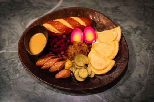 Smoked sausage, potato & cheese pierogies, marinated beets, pickled egg, caramelized onions, warm pretzel, German mustard, and cheese fondue