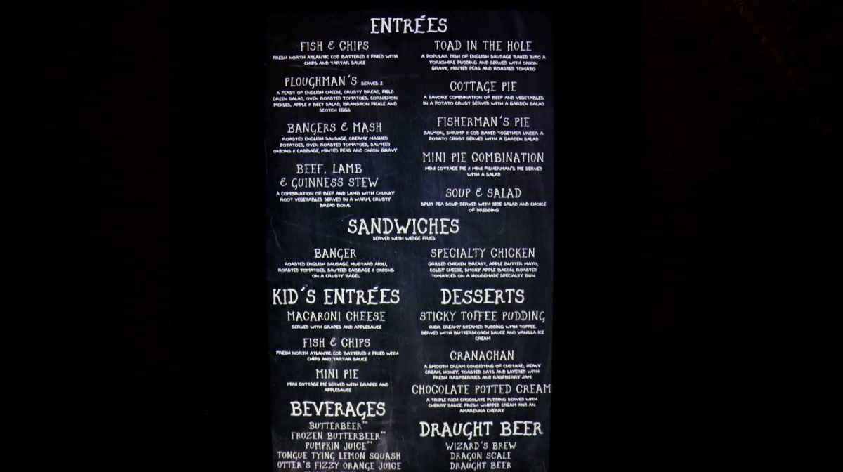 In the fictional world of Harry Potter, The Leaky Cauldron represents a beloved pub and inn that Harry and his friends visited annually. The start of every school year meant a visit to Diagon Alley to gather all the school supplies needed – and, as many of us know, the way to access Diagon Alley is through an enchanted brick wall behind Leaky Cauldron. In order to stay consistent with the design of the London waterfront area, however (and to maximize guest flow in and around the entire theme-park land), Universal’s version of Leaky is tucked away behind that magical brick wall – but that doesn’t mean that the restaurant still isn’t the perfect way to either start or cap off an enthralling visit to Diagon.