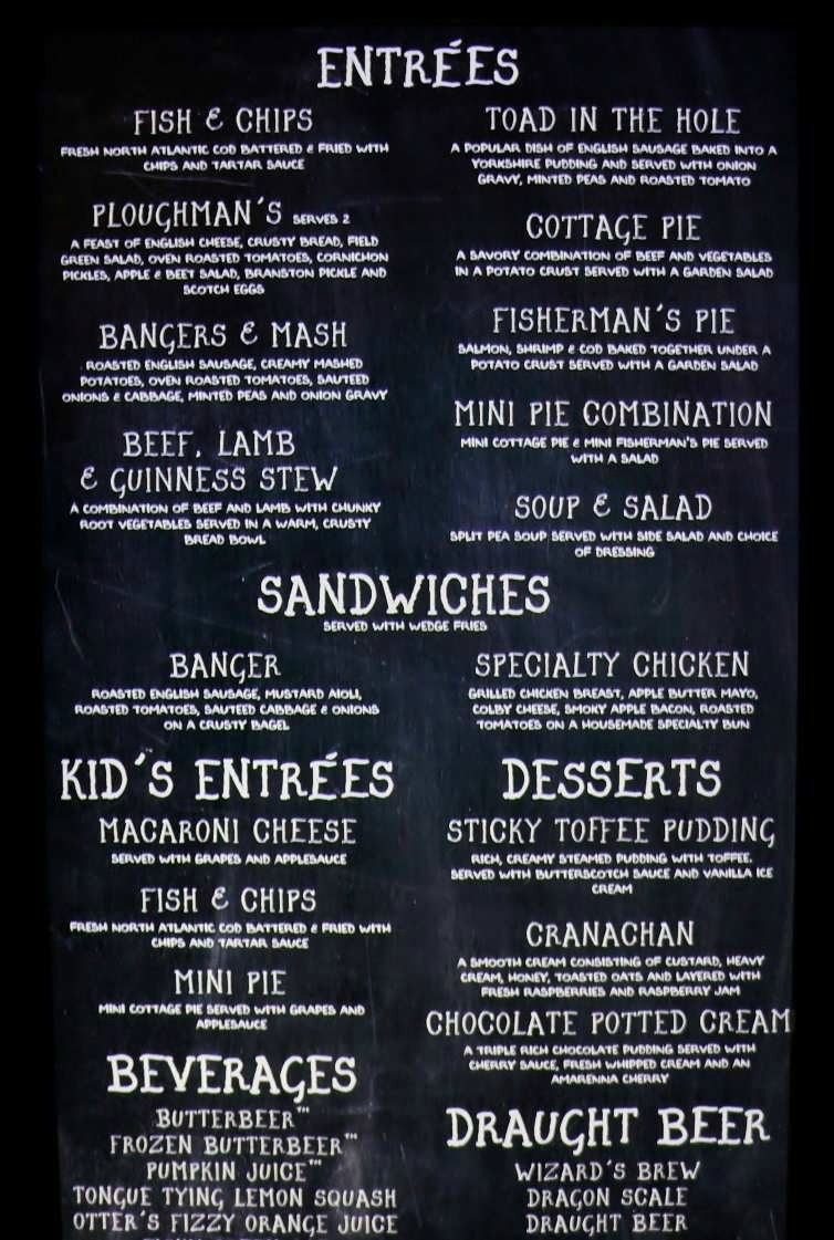 After touring Diagon Alley my friend and I enjoyed lunch at the Leaky Cauldron. She had the fish and chips which were delivered hot, was a nice portion size and tasted delicious. I tried something new, toad in the hole. It was very tasty and the vegetables served with it were cooked perfectly. Our Peachtree Fizzing Tea was awesome! I only wish we could visit again soon!
