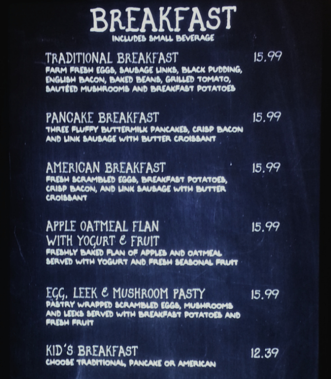 Farm-fresh eggs, sausage links, black pudding, English bacon, baked beans, grilled tomato, sauteed mushrooms, and breakfast potatoes